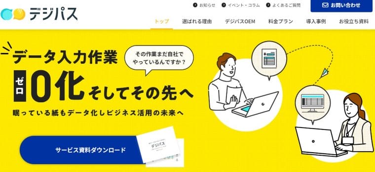 | デジパス | 初期費用:0円~ 月額費用:60,000円(税要確認)~ | 読み取り後の修正・データ化まで対応 | 要問合せ | 〇 |
