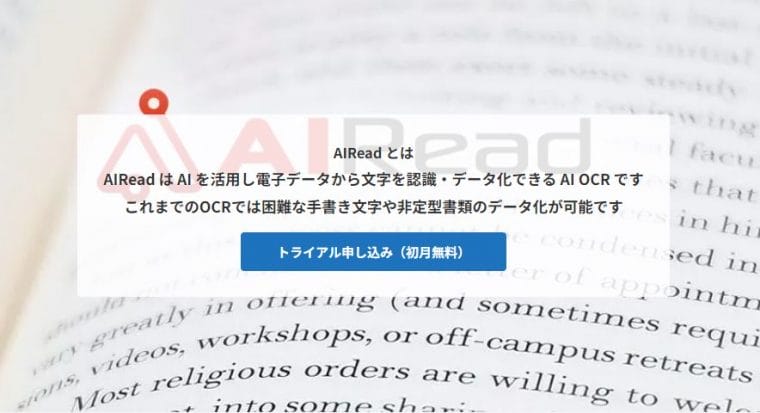 | AIRead | 初期費用:220,000円(税込)~ 月額費用:11,000円(税込)~※クラウド型の料金 | 手書き文字と活字の両方に強い | 日本語、英語、中国語(簡体字、繁体字)、タイ語、ベトナム語などの東南アジア圏、ロシア語 | 〇 |