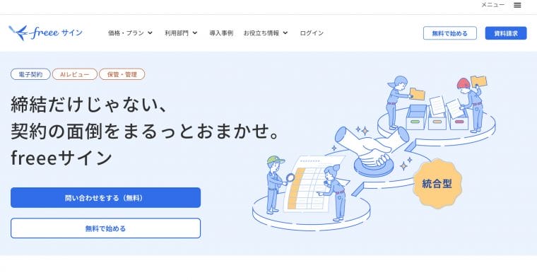 『freeeサイン』は、freeeサイン株式会社が提供する電子契約サービスです。「統合型法務サービス」として豊富な機能をそなえており、契約書の作成・チェックから送信、締結、管理や文書保管までカバーします。