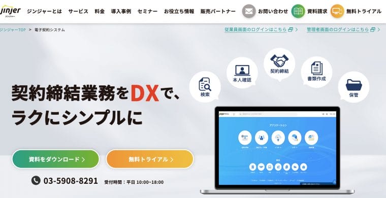 『ジンジャーサイン』は、jinjer株式会社が提供する電子契約サービスです。契約書の作成や送受信、社内ワークフローのほか、契約書のステータス管理や文書保管までこれひとつで行えます。