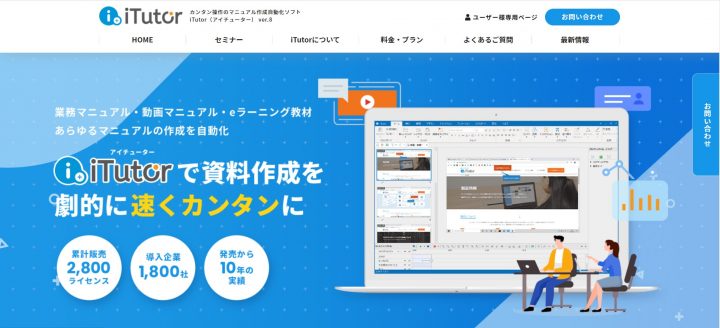 | iTutor | 要問い合わせ | プロフェッショナルエディション:66万円~ スタンダードエディション:49.5万円~ エントリーオフィスエディション:27.5万円~ | 全日本空輸株式会社 株式会社ジェーシービー 株式会社学研ホールディングス ヤマハ株式会社 | 〇 | セミナー実施 お役立ち情報配信 製品サポート 操作動画集など各種コンテンツ レクチャー実施 |