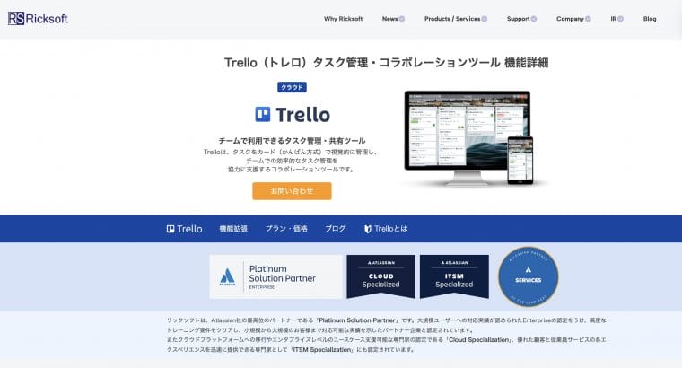 『Trello(トレロ)』はリックソフト株式会社が提供している、チームで利用できる「カンバン方式タイプ」のタスク管理・コラボレーションツールです。