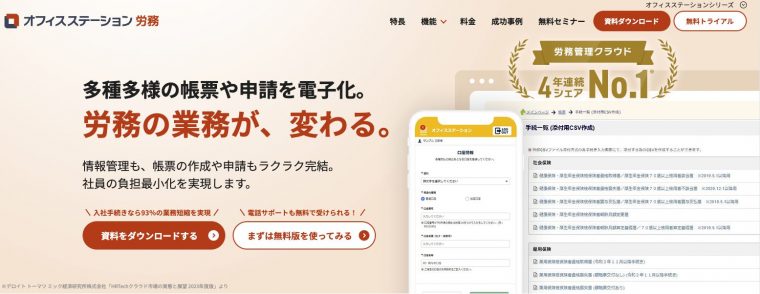 | オフィスステーション 労務 | 【初期費用】 11万円 【利用料金】 月額440円/人 | 30日間 | 35,000社以上 | × | ◯ | ◯ | × | × | × |