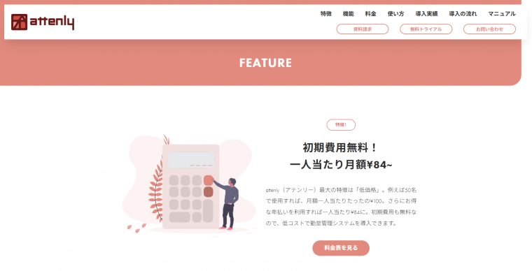 アテンリーは、初期費用0円・1人あたり月額84円から利用できる勤怠管理システムです。