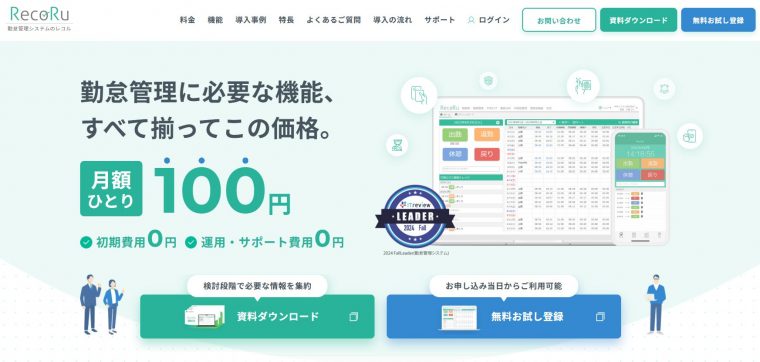 RecoRuは、初期費用0円かつ1人あたり月額110円で利用できる勤怠管理システムです。