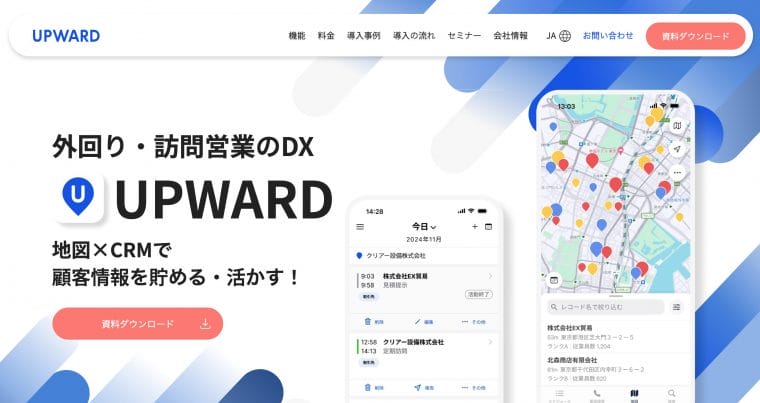 『UPWARD』は、UPWARD株式会社が提供する外回りの効率化におすすめのCRMツールです。外回り・訪問営業に特化したサービスで、訪問履歴はスマートフォンで自動登録。誰がどこに訪問したのか登録されるため、日報作成の手間を省くことができます。