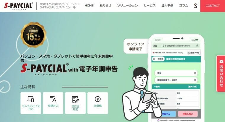 『S-PAYCIAL with 電子年調申告』は、パソコン・スマホ・タブレットからいつでもどこでも年末調整申告が可能な年末調整システム。