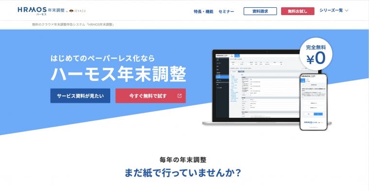 『HRMOS(ハーモス)年末調整』は、株式会社ビズリーチが提供している年末調整ソフトです。クラウドで利用できるソフトになっており、オンライン上で申告書の作成や回収、保管が行えます。オンライン上で完結できるため、紙の配布は不要となり、ペーパーレス化にも貢献。