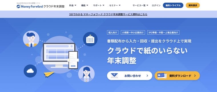 株式会社マネーフォワードが提供している『マネーフォワード クラウド年末調整』は、年末調整に必要な書類の配布・回収から年税額の計算、行政機関への電子手続きまでを一元的に行えるソフトです。
