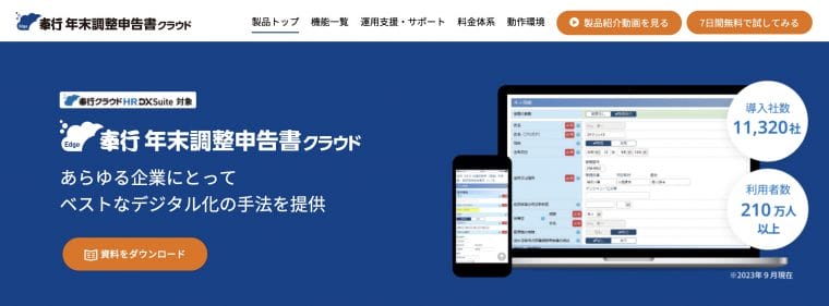 | 機能 | 従業員通知・従業員提出 提出状況管理・内容確認 申告書出力・給与システム連携 奉行製品連携 |